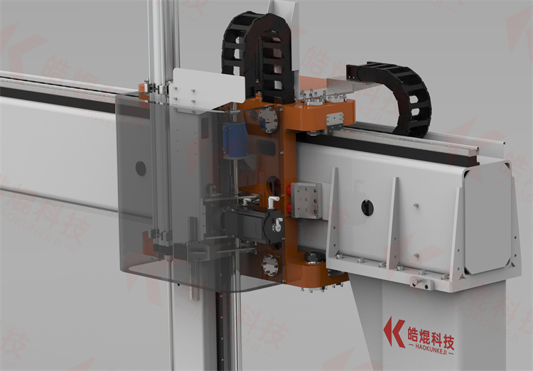 桁架機器人由多維機器人行走軸搭建而成。各機器人行走軸由型鋼焊接而成,滾輪直線導軌和齒輪齒條及伺服電機等組成。作為運動框架和載體的型鋼其截面形狀通過有限元分析法來優化設計,生產中的精益求精確保其強度和直線度,采用滾輪距型導軌作為運動導軌,運動傳動機構采用減速機和齒輪齒條或滾珠絲杠。